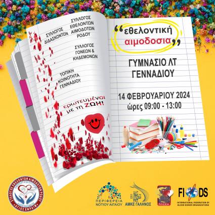 Αύριο, Τετάρτη 14 Φεβρουαρίου 2024, το Γυμνάσιο ΛΤ Γενναδίου φιλοξενεί μια σημαντική εκδήλωση που αγγίζει την καρδιά της αλληλεγγύης και της ανθρωπιάς - μια αιμοδοσία που ...