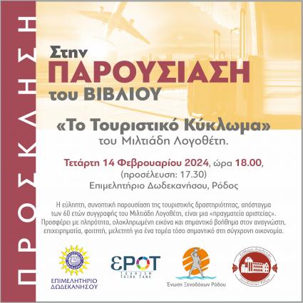 Παρουσίαση του βιβλίου «Το Τουριστικό Κύκλωμα», του Μιλτιάδη Λογοθέτη, την Τετάρτη 14 Φεβρουαρίου 2024 και ώρα 18:00 στο ...