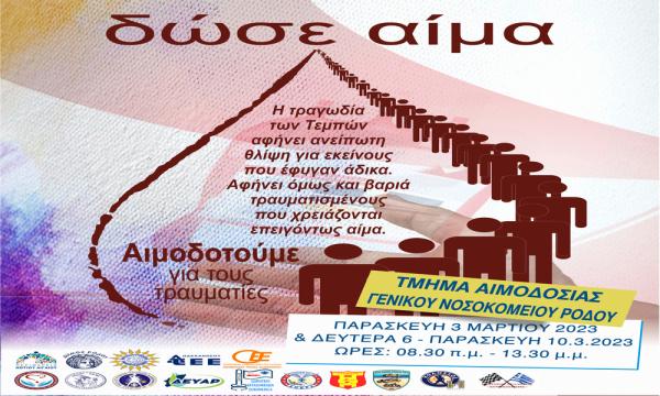 Έκτακτη αιμοδοσία διοργανώνουν ο Σύλλογος Εθελοντών Αιμοδοτών Ρόδου, η Περιφέρεια Νοτίου Αιγαίου, ο Δήμος Ρόδου, το Εμπορικό και Βιομηχανικό Επιμελητήριο Δωδεκανήσου, το ...