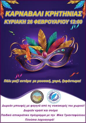 Καρναβάλι στην Κρητηνία την Κυριακή 26 Φεβρουαρίου στις 12 το μεσημέρι. Πλούσιος μπουφές απο φαγητά μαγειρεμένα απο τις γυναίκες του χωριού,κρασί,σούμα και πλούσιο παιδικό ...