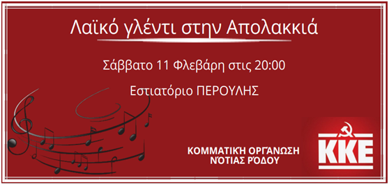 Η κομματική οργάνωση Νότιας Ρόδου του ΚΚΕ διοργανώνει το Σάββατο 11/02 στην Απολακκιά λαϊκό γλέντι, με ζωντανή μουσική, στις 20:00 , στο εστιατόριο «ΠΕΡΟΥΛΗΣ».