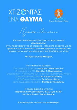 Την Παρασκευή 09η Δεκεμβρίου 2022, ώρα 17.30’, στο ξενοδοχείο Rodos Palace θα γίνει η παρουσίαση του επετειακού – ιστορικού βιβλίου «Χτίζοντας ένα θαύμα» της Ένωσης Ξενοδόχων ...