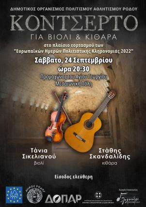 Ο ΔΟΠΑΡ και η ΕΦΑ Δωδεκανήσου διοργανώνουν κοντσέρτο για βιολί και κιθάρα στον Προμαχώνα του Αγίου ...