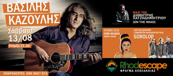 Το Σάββατο 13 Αυγούστου ο Βασίλης Καζούλης επιστρέφει στον τόπο του για μια μοναδική συναυλία !!Στην νότια πλευρά του νησιού, στην παραδεισένια λίμνη της Απολακκιάς στο ...