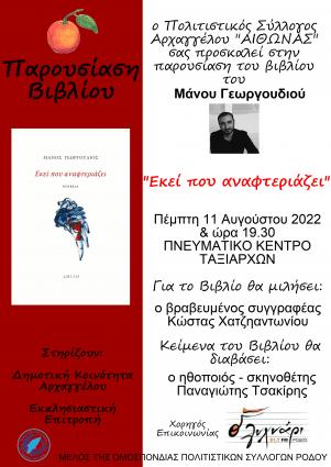 Ο Πολιτιστικός Σύλλογος Αρχαγγέλου «Αίθωνας» σε συνεργασία με τη Δημοτική Κοινότητα Αρχαγγέλου παρουσιάζουν την Πέμπτη 11 Αυγούστου στις 19.30, στο Πνευματικό Κέντρο ...