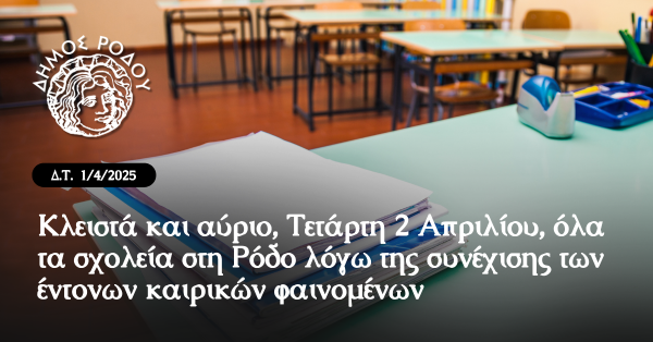 Κλειστά τα σχολεία όλων των βαθμίδων και αύριο Τετάρτη 2 Απριλίου λόγω της συνέχισης των έντονων καιρικών ...
